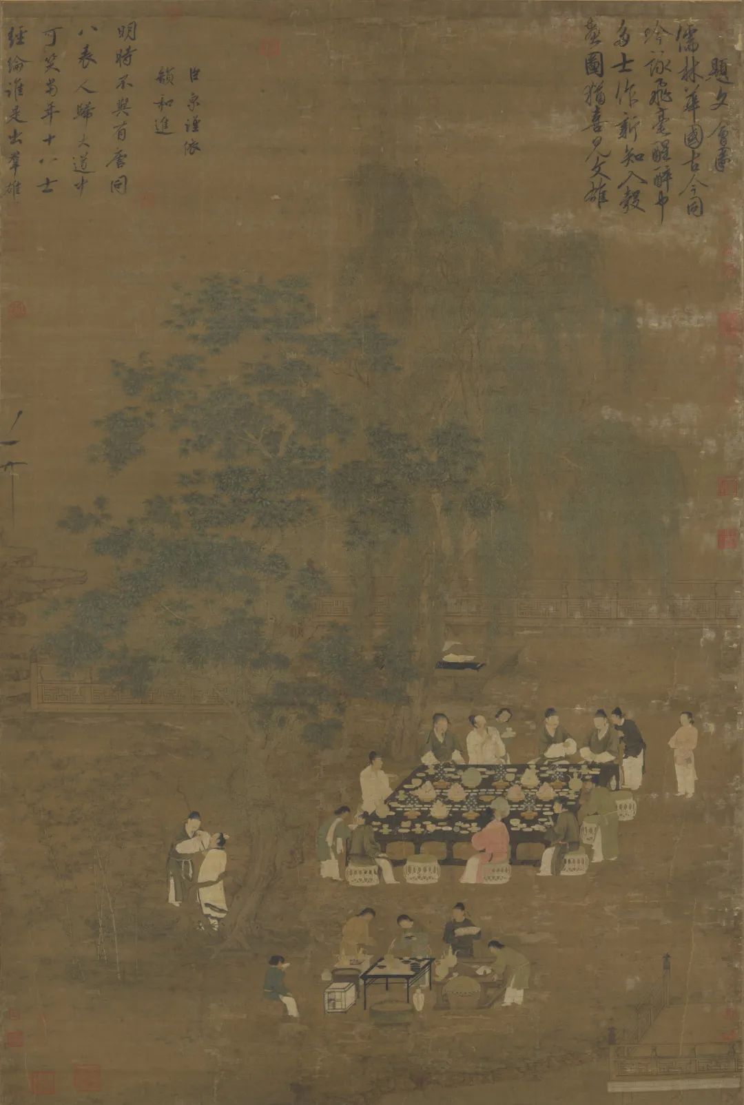 据台北故宫介绍:西园雅集是历史上最富盛名的雅集传说——苏轼(1037-1101)、黄庭坚(1045-1105)、李公麟(1049-1106)、米芾(1052-1108)、王诜(约1048-1104)等文艺天才,齐聚汴京(开封)举办了一场盛会。千年来这场并未发生的风雅韵事,不断受到传颂,成为历代雅集仿效的原型。