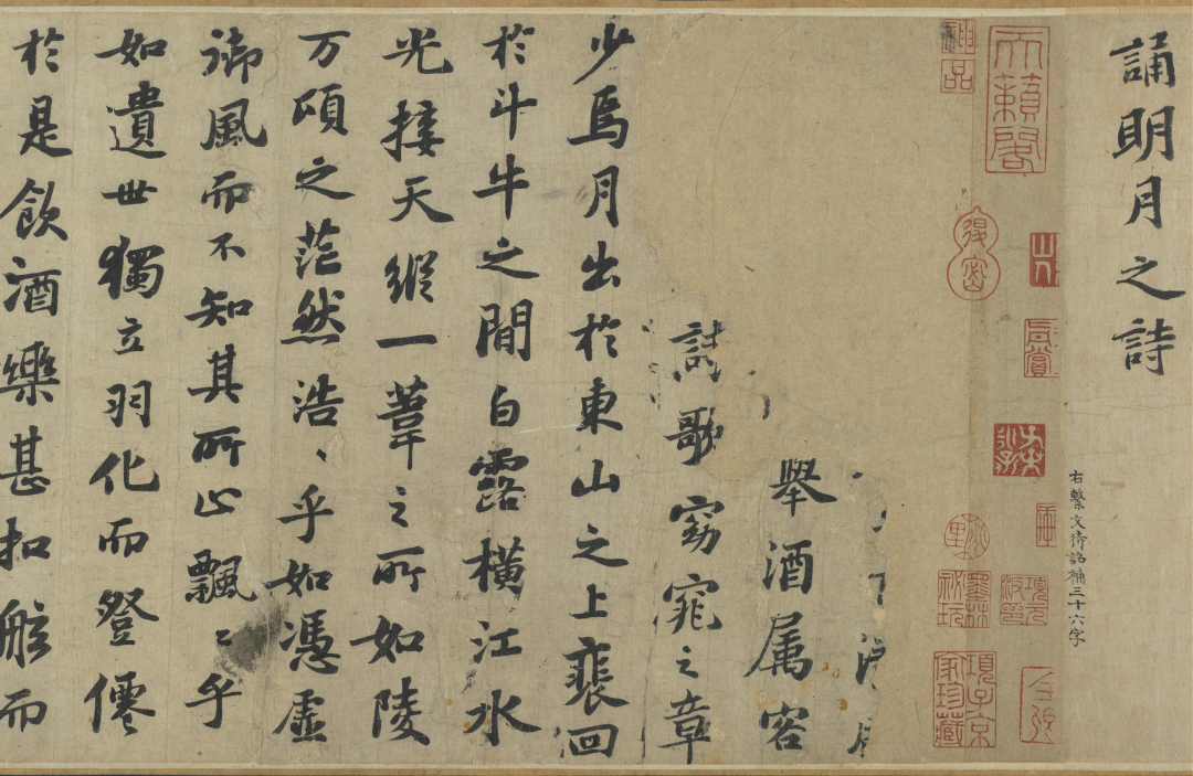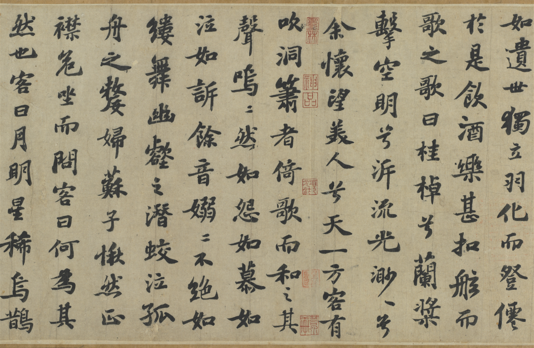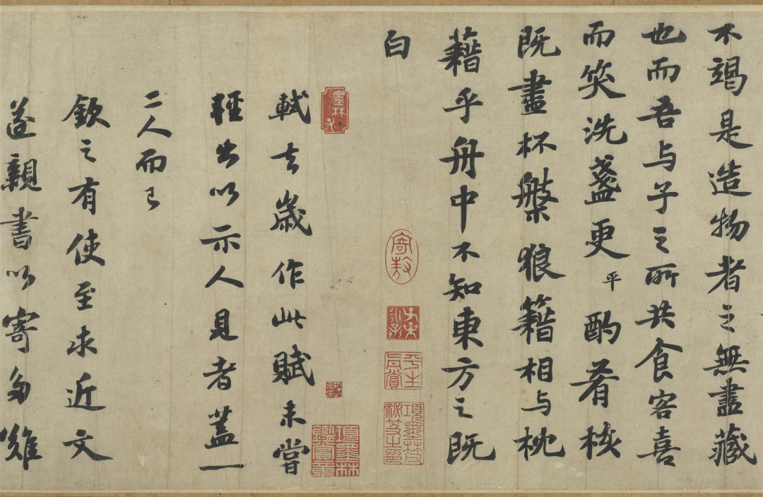 本次特展以“西园雅集”图像揭开第一单元的序幕。此图据说由李公麟绘制,内容包括苏轼挥毫、李公麟画图、陈景元(1035-1094)拨阮、米芾题石、圆通大师(1016-1082)谈无生论等场景。这群文化菁英的墨迹,与牵动时局的司马光(1019-1086)、欧阳修(1007-1072)等名臣作品及《元祐党籍碑》皆搭配展出,有助感受当时的历史背景。第二单元“舒心畅意”旨在彰显这批文艺天才的书画艺术成就。书法方面,苏轼《前赤壁赋》、黄庭坚《自书松风阁诗》、米芾《蜀素帖》等名作,呈现北宋末多元且富个人情性的尚意书风;绘画方面,李公麟稀世真迹《五马图》、《山庄图》的忠实摹本、《九歌图》,以及米芾《云山并自书跋》等画作,则可一窥北宋文人画的各种观点与实践。第三单元“百代典范”,挑选后人对苏轼、黄庭坚、米芾、李公麟的临仿之作,展现他们对书画发展的深远影响。