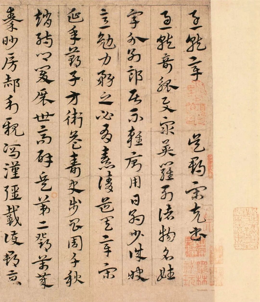 这个时期存留在刻帖中的章草名作就有较多的这种侧切而入的笔法。如皇象《急就章》中的横画,侧锋(锋尖)入纸,如同后世写楷书的笔法,索靖《月仪帖》也多用此法。不知这种风格的出现与后人刻帖时的加工有无关系。因为我们在皇象《急就章》的笔画中,很难找到当时所应有的浑厚气象。所以,笔者个人认为,在学习《急就章》这样的范本时,要多参看一些当时人留下的墨迹,研究他们的用笔方式,才不至于写成元朝以后人章草的那个样子。