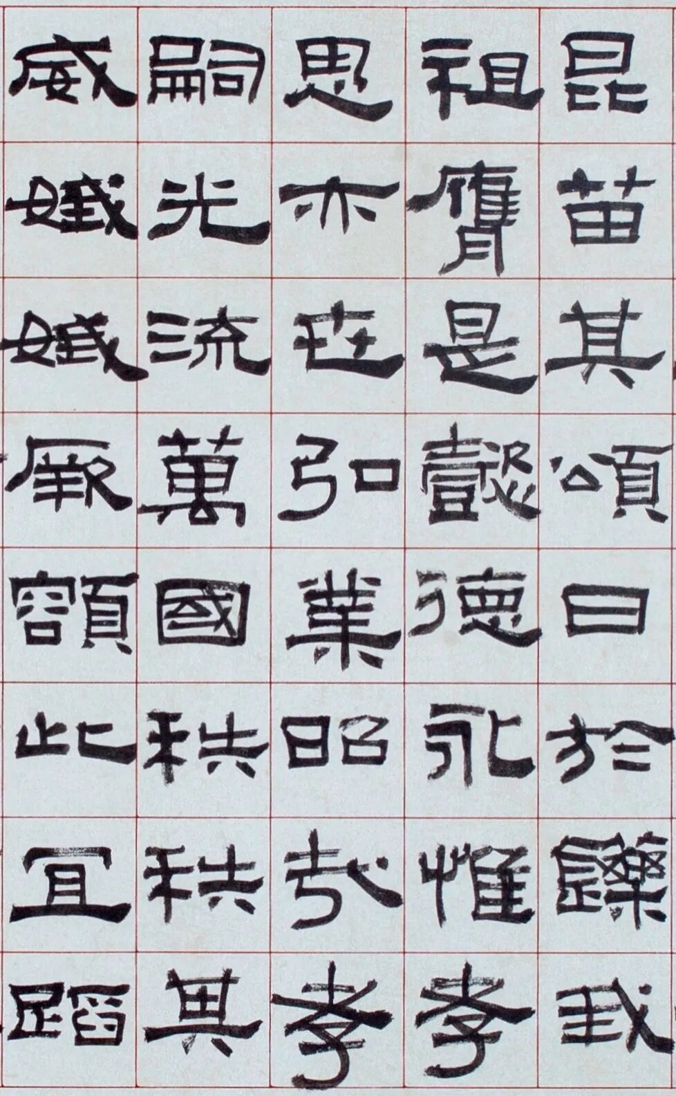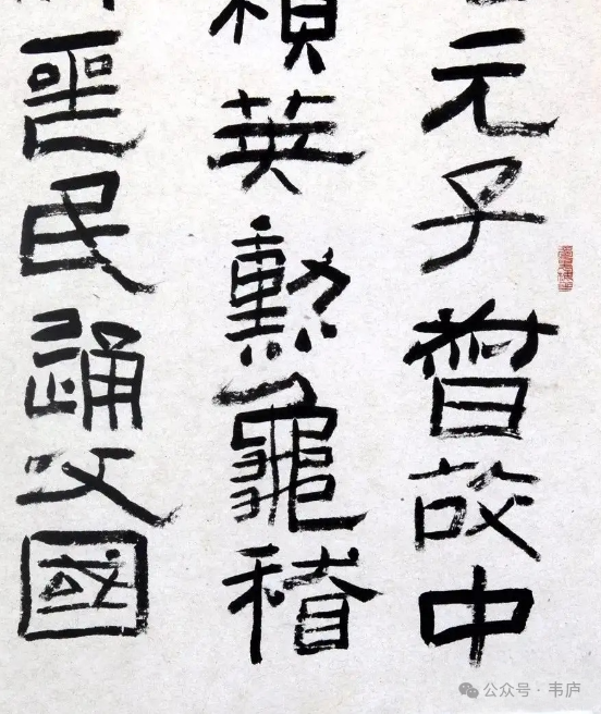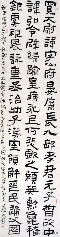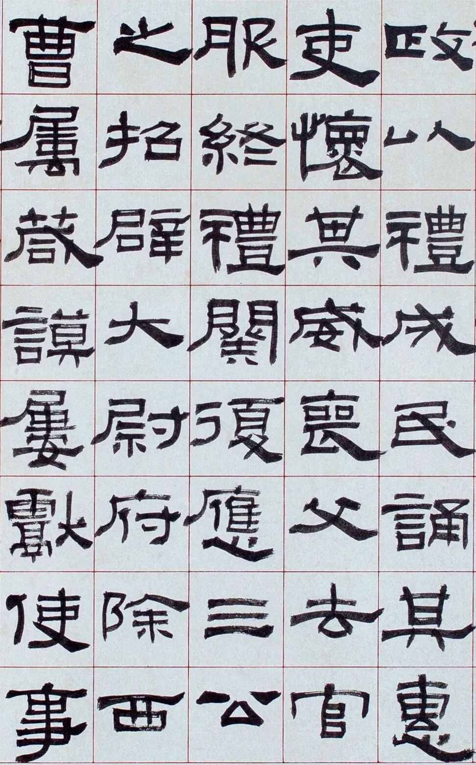 《鲜于璜碑》以方笔为主,方中有圆,以方直多变取胜,笔画深沉稳重。行笔强调涩行,行笔时不漂不滑,且慢且涩,又涩而直。横折处呈方折,棱角分明,特别是横画起笔与竖画收笔,几乎笔笔方正,横竖点画多取平直,有的略带歪斜,拙重中寓灵秀,朴厚中见睿智,行笔中有提按、有顿挫,点画蕴藉朴厚,有入木三分之力。代表了东汉时期隶书艺术的最高成就之一,是汉隶方笔系统的代表作。