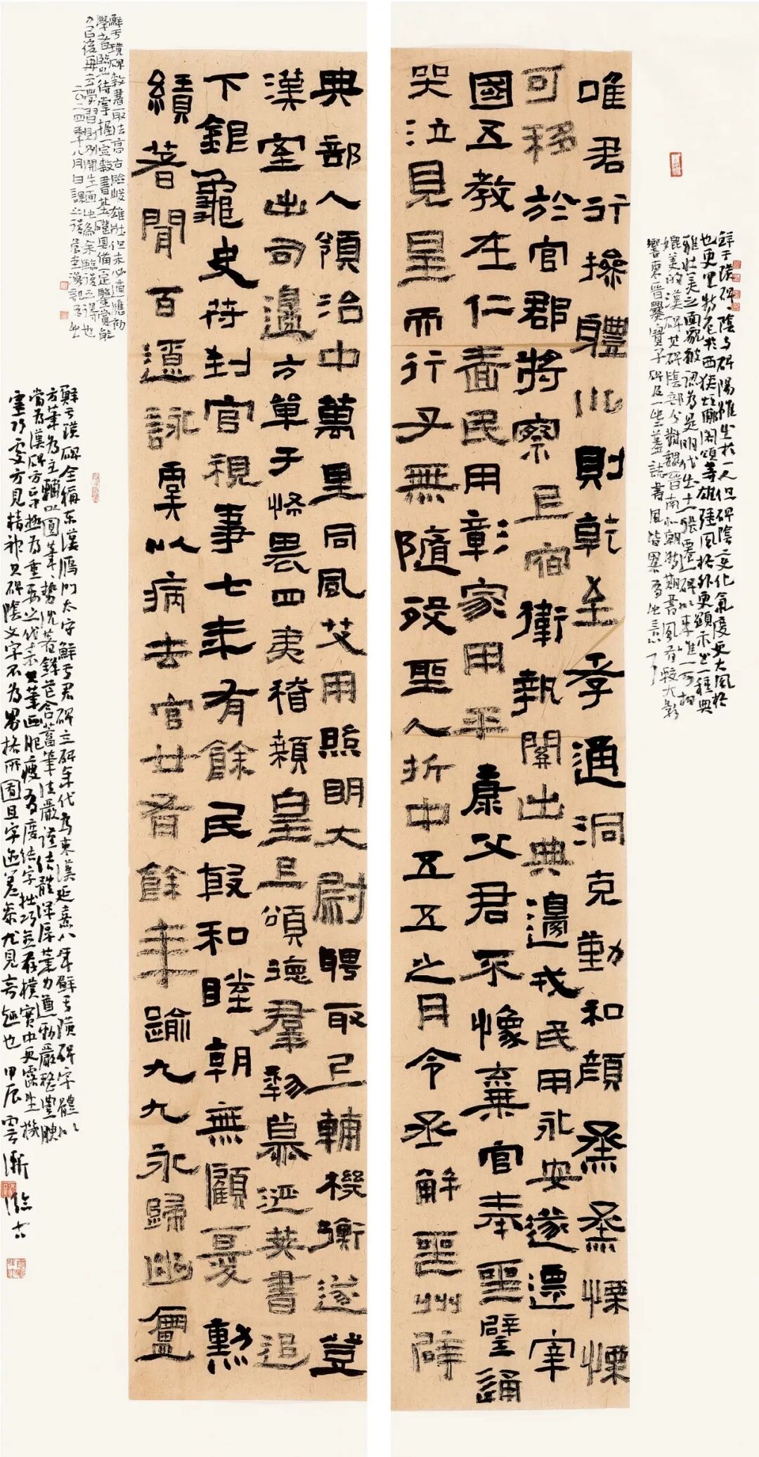 从章法布局上看,两碑各有千秋。《鲜于璜碑》章法整齐,竖成行、横成列,整体排列略显参差,疏密得体,错落有致。《张迁碑》章法更为活泼,字间和行间无严格固定距离,疏密对比强烈,整体上更显灵动。