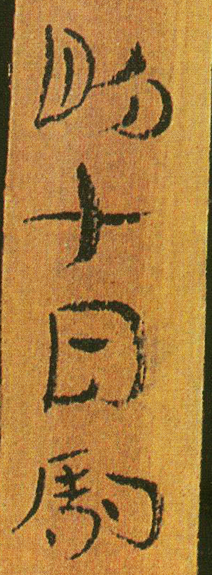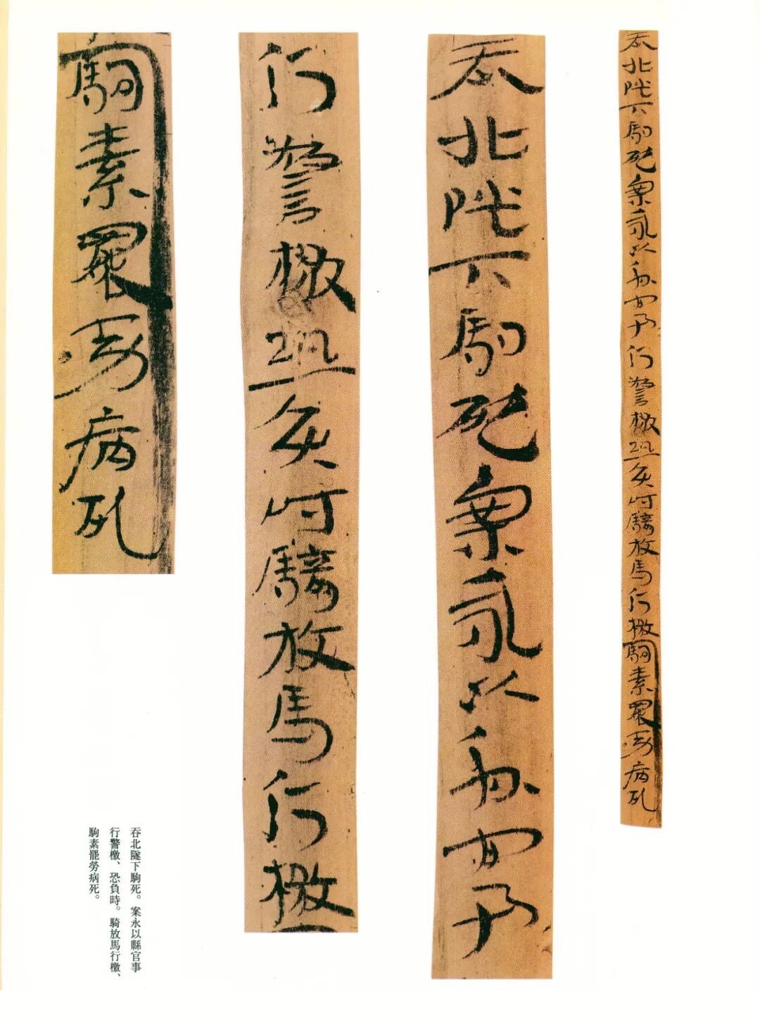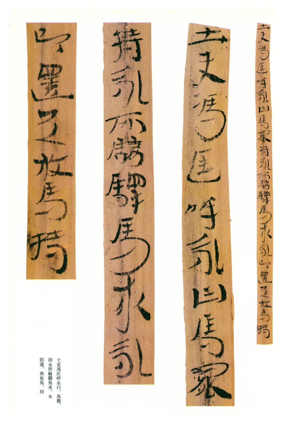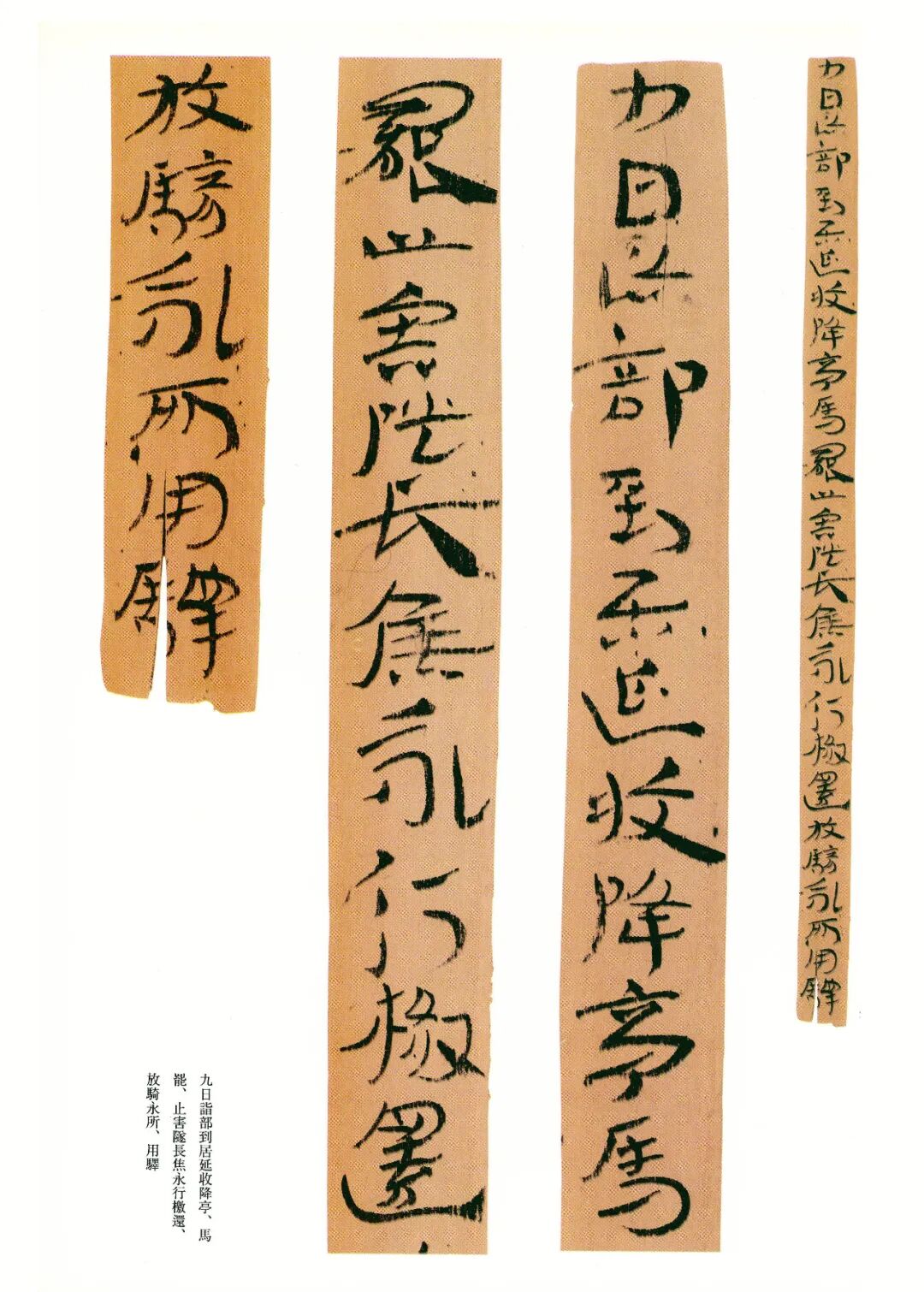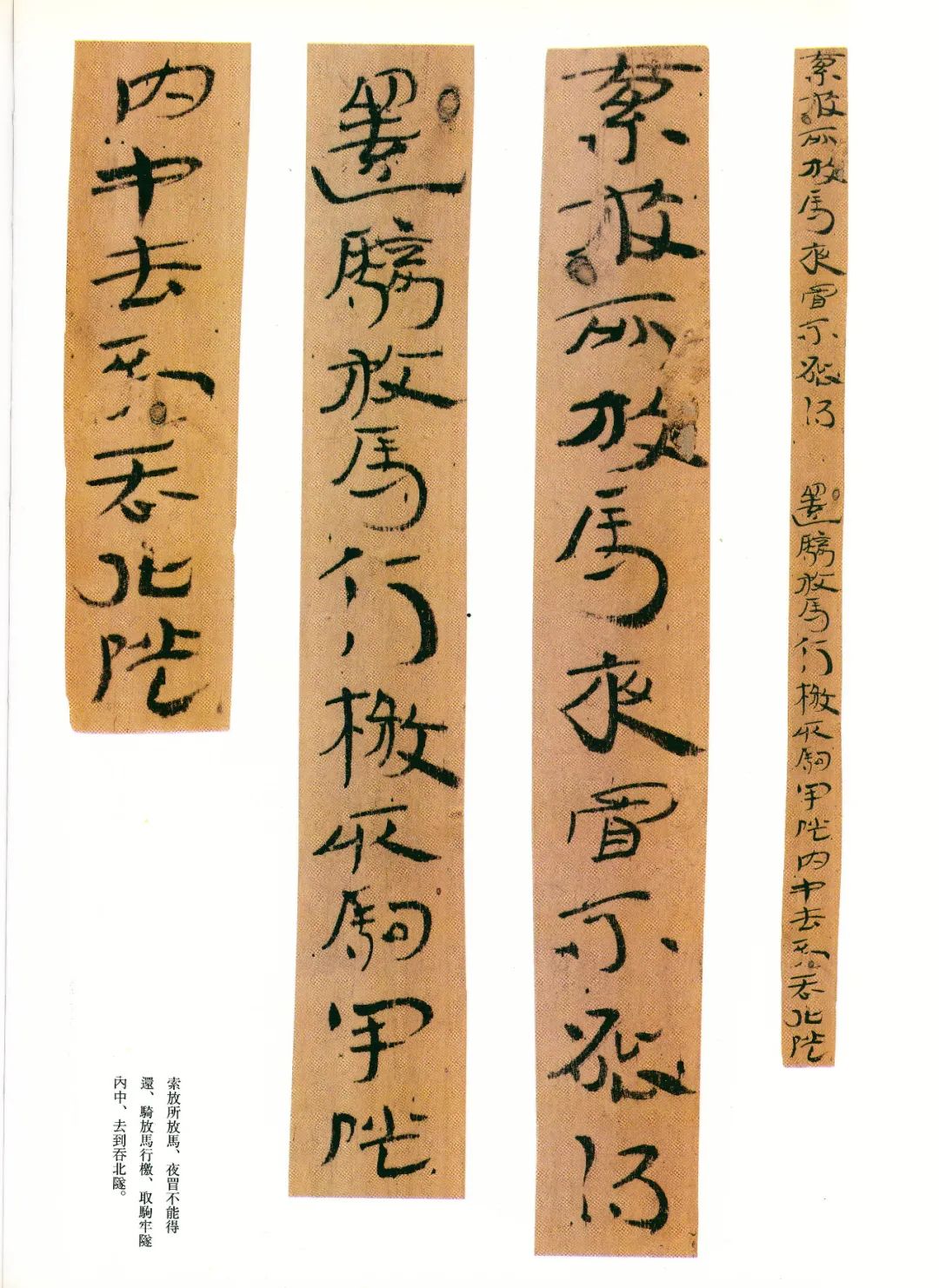 《误死马驹册》属居延简中较具艺术水准的章草作品。启功先生描述汉代章草时说:“汉代草书简牍中的字样,多半是汉隶的架势,而简易地、快速地写去。所以无论一字中间如何简单,而收笔常带出燕尾的波脚。且两字之间绝不相连。”日常草体到西汉末发展成一套约定俗成的技法,《误死马驹册》可谓两汉之交代表性章草样式之一。